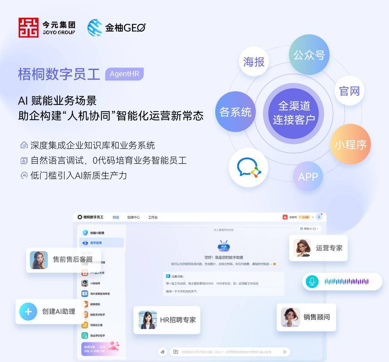 在人力资源外包服务的基础上,今元集团将AI大模型深度应用于人力资源管理场景中,自主研发一体化智能人事管理系统和梧桐数字员工AgentHR,实现从内部运营到外部赋能的全链条智能化升级。